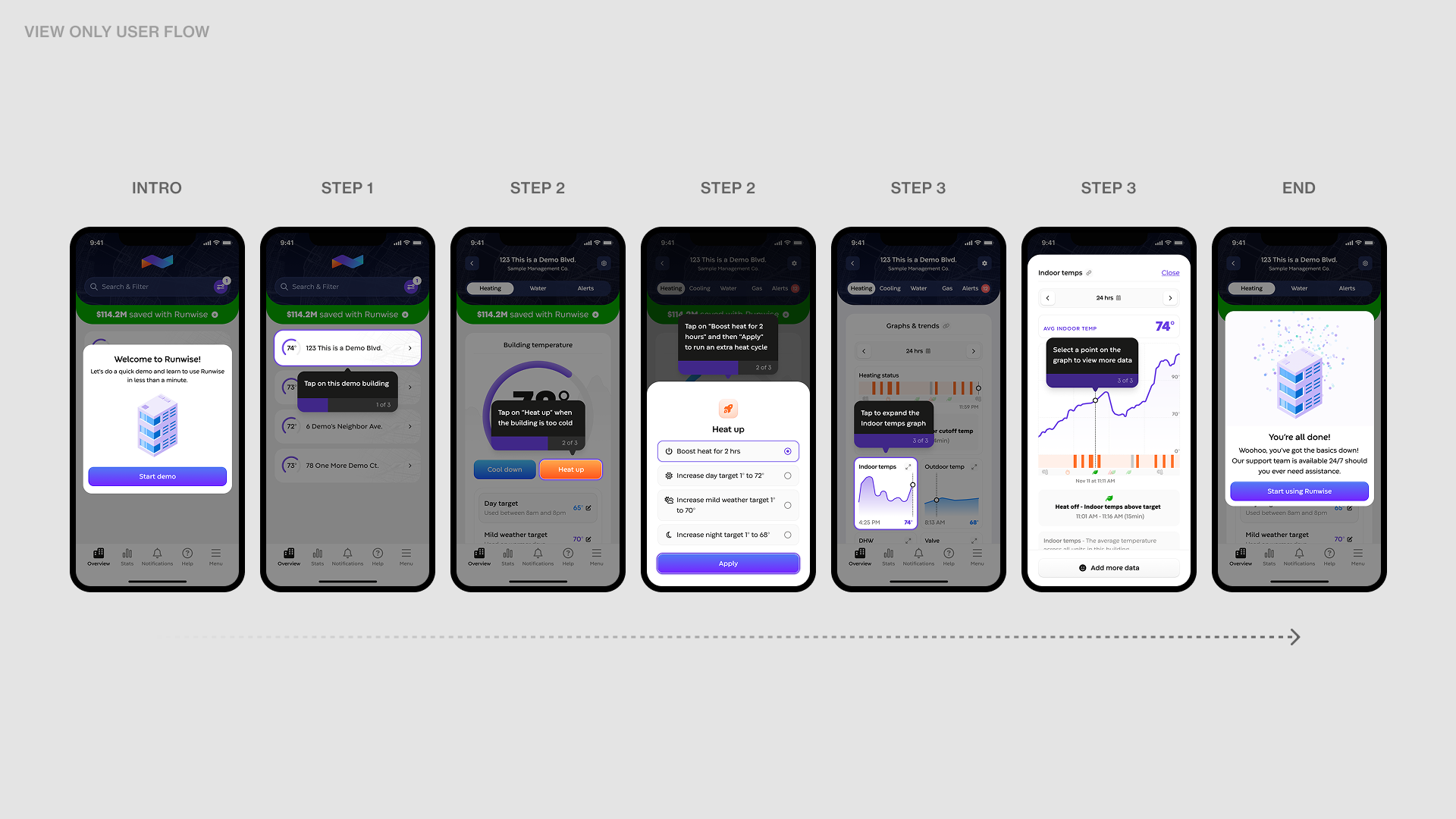 For building users and view-only roles, the flow adapts to permissions, focusing on discovery and interpretation before actions: